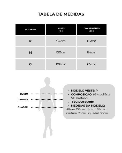 ARRASTE A FOTO DO PRODUTO PRO LADO E CONFIRA COMPOSIÇÃO DE TECIDOS E MEDIDAS DE CADA PEÇA.