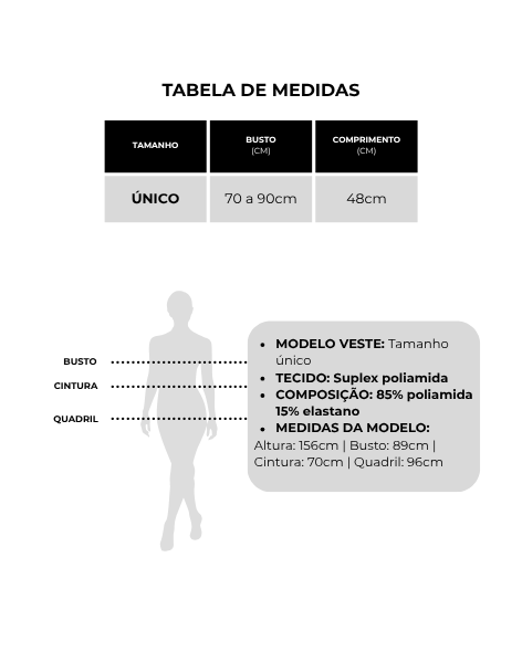 Confeccionado em malha de poliamida premium, oferece conforto, elasticidade e se adapta ao corpo facilmente — ideal para compor looks elegantes e versáteis em todas as estações.